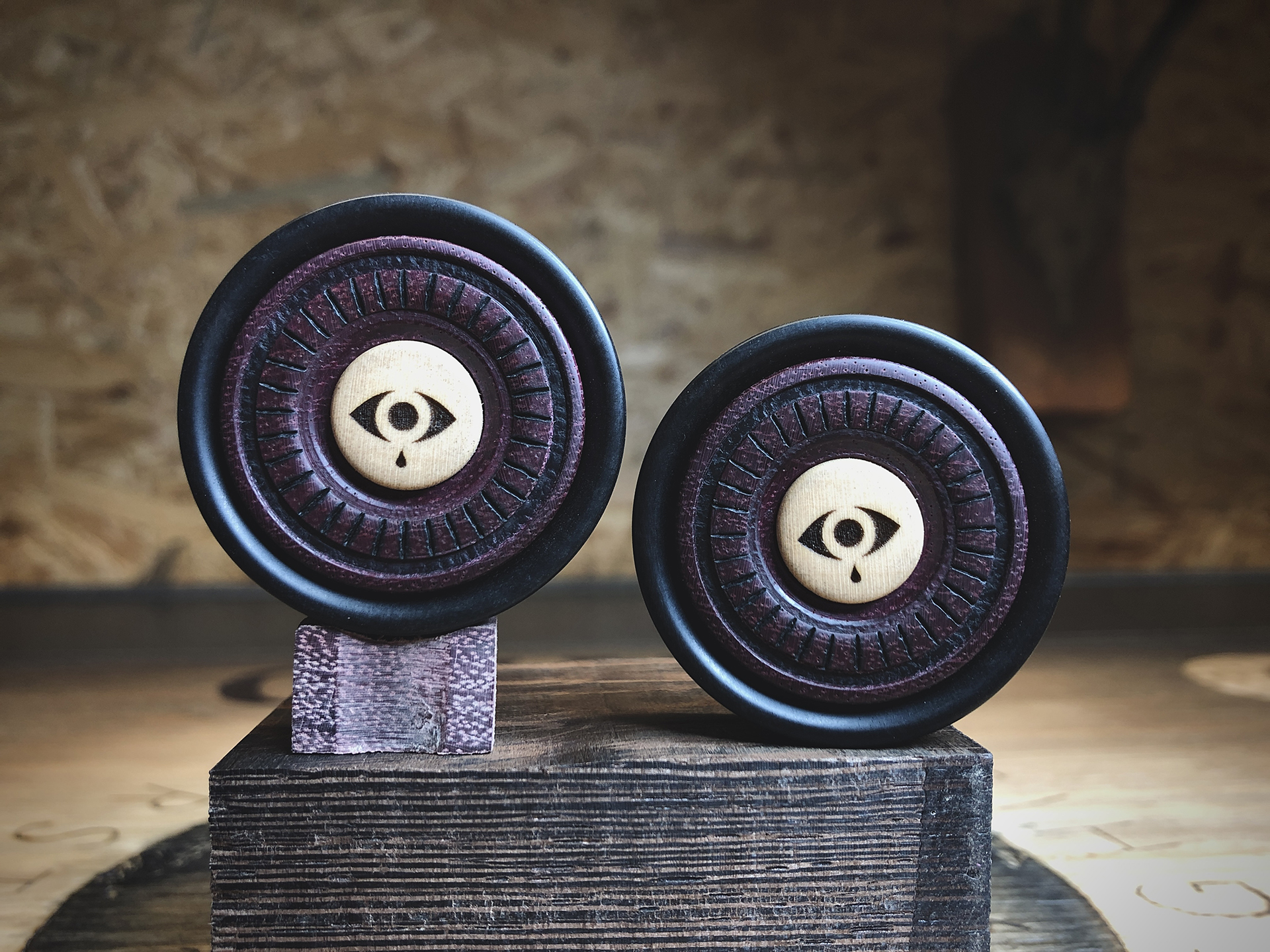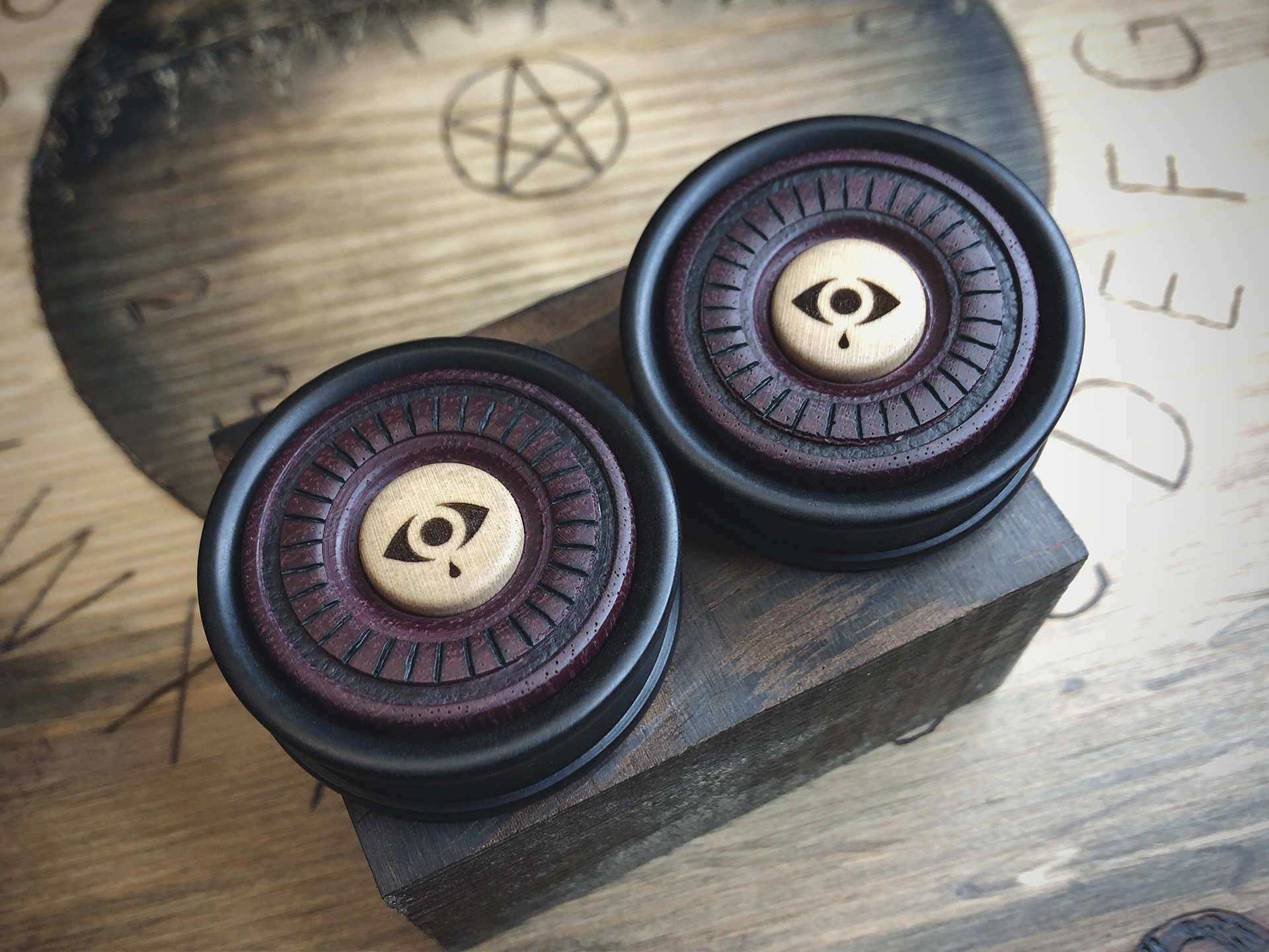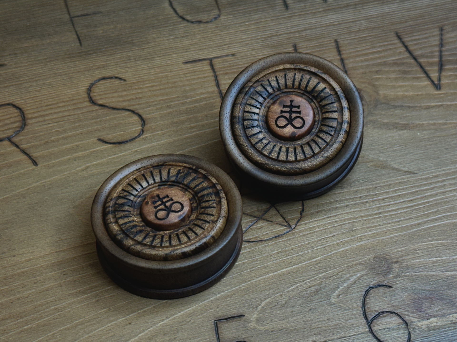 . Wooden plug with 2 inlays and Rays and symbol pyrographies