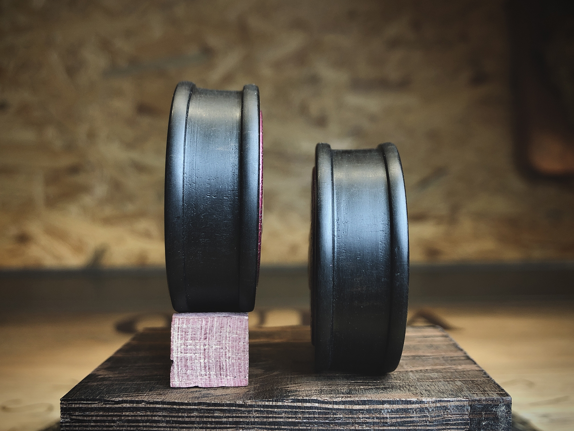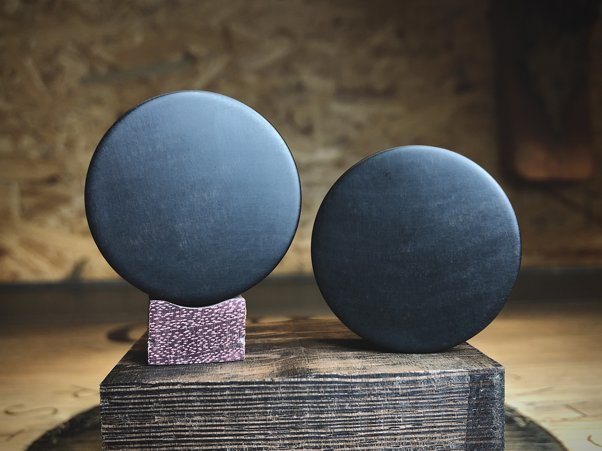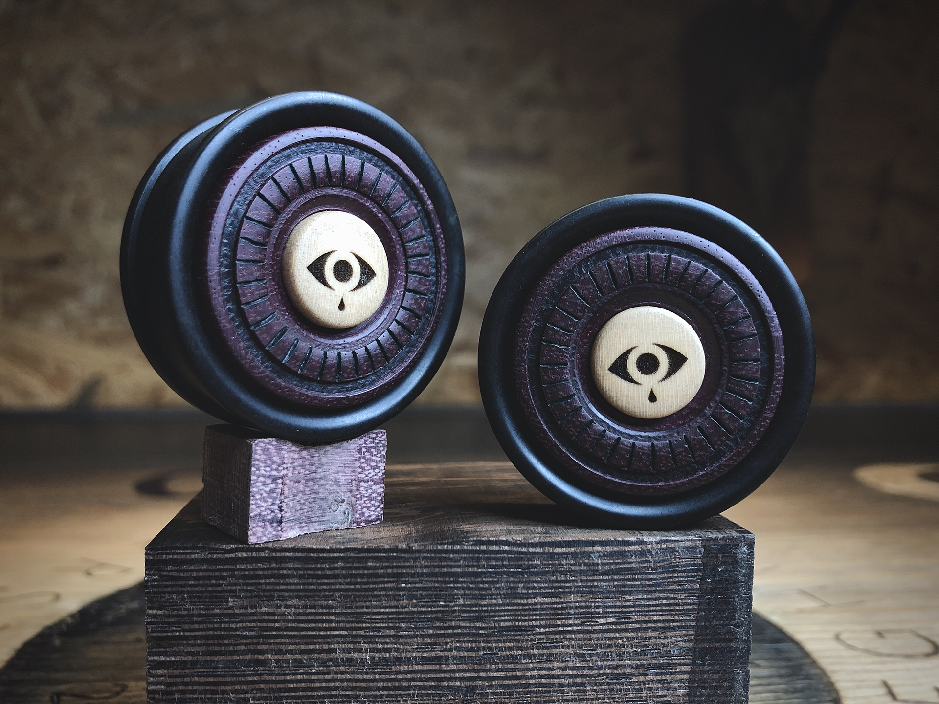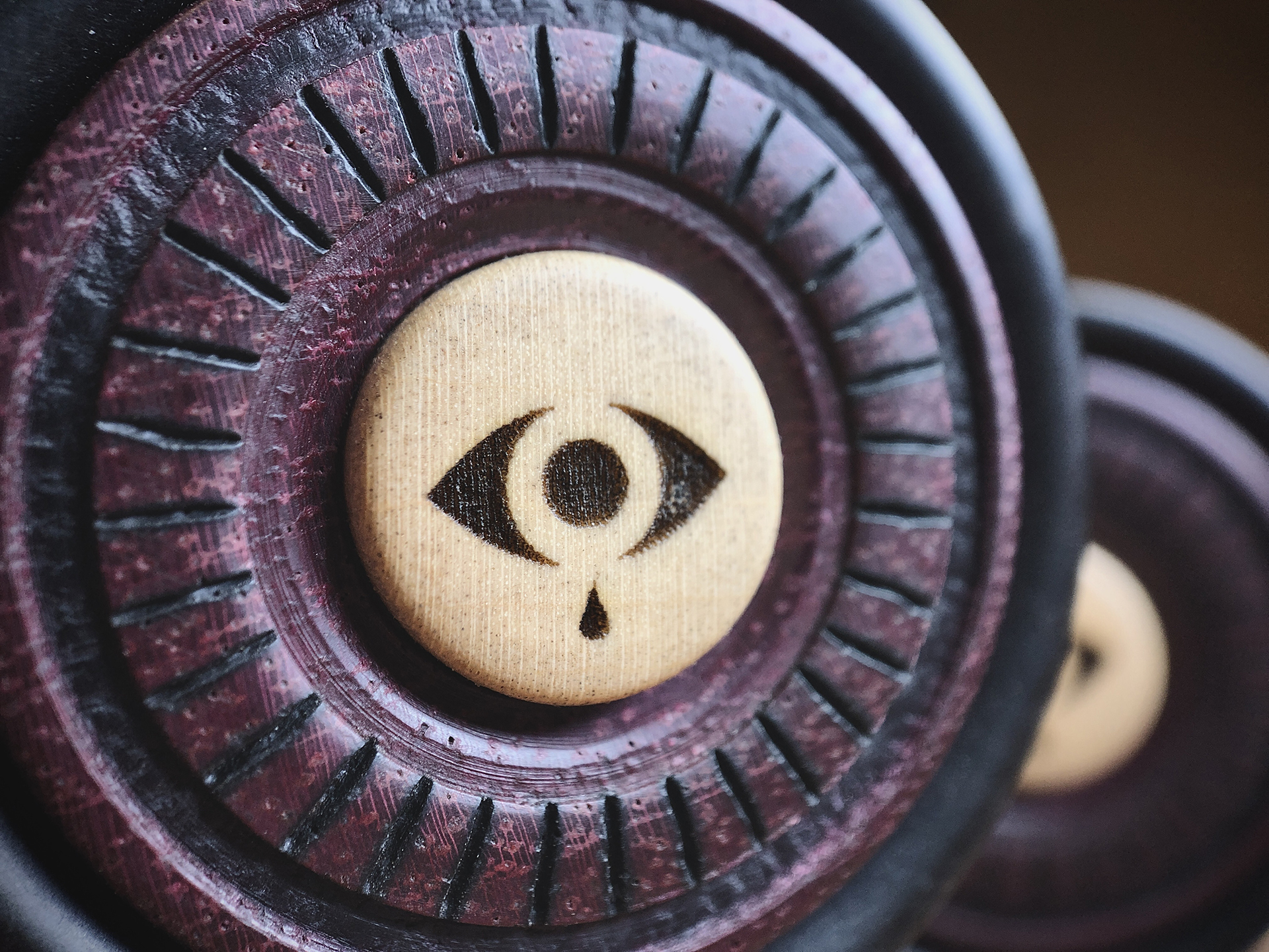 . Wooden plug with 2 inlays and Rays and symbol pyrographies